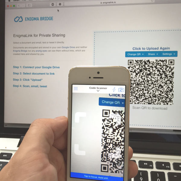 Documents are encrypted with a state-of-the-art AES hardware encryption and stored in your own Google Drive account. Neither Enigma Bridge nor any prying eyes can see your documents without the links (or QR codes) that are generated by your own browser.